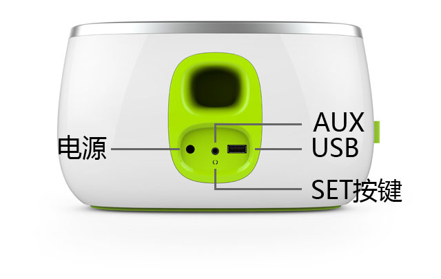 AUX(3.5mm):可将比巴智能音响作为普通的多媒体音响使用,播放外接设备的音乐。电源:电源接口。