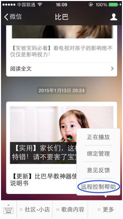 远程遥控需要通过微信公众号来实现,app本身是没有这个功能的。大家可以扫描以下二维码关注比巴公众号,点击公众号底部的【更多】菜单,就可以看到有关远程遥控的帮助和操作方法了。