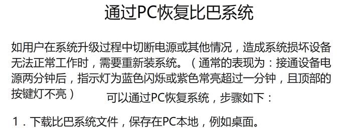 如用户在系统升级过程中切断电源或其他情况,造成系统损坏设备无法正常工作时,需要重新装系统。(通常的表现为:接通设备电源两分钟后,指示灯为蓝色闪烁或紫色常亮超过一分钟,且顶部的按键灯不亮)