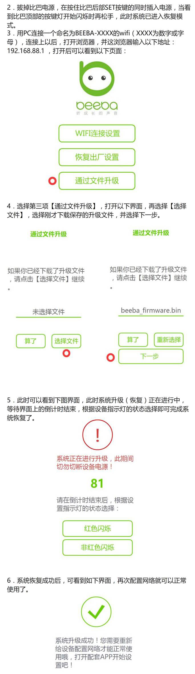 2、将文件beeba_firmware.bin(务必确保文件名为beeba_firmware.bin)放在U盘根目录,插入到比巴设备的USB接口(该文件下载地址为:http://api.beeba.cn/apps/firmware)