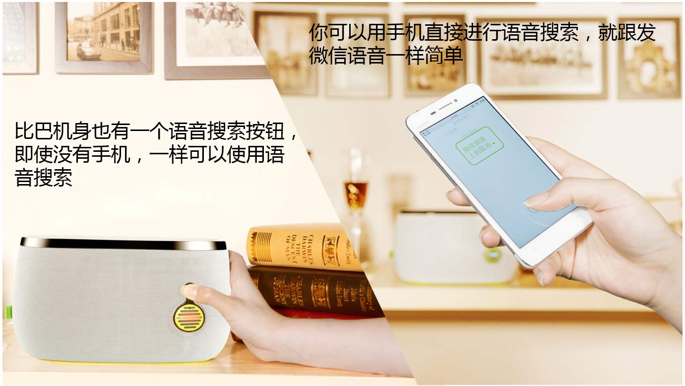 在正常工作模式下,通过app、微信公众号,或者比巴音乐面包正面的语音按钮,都可以进行语音搜索,按下说话,说完之后松手,就会自动搜索歌曲并播放。例如说“放一首蓝精灵”、“来一首黎明唱的忘情水”或者“放一些爵士乐”、“来一些儿歌吧”,都可以准确的为您进行播放,快试试吧!